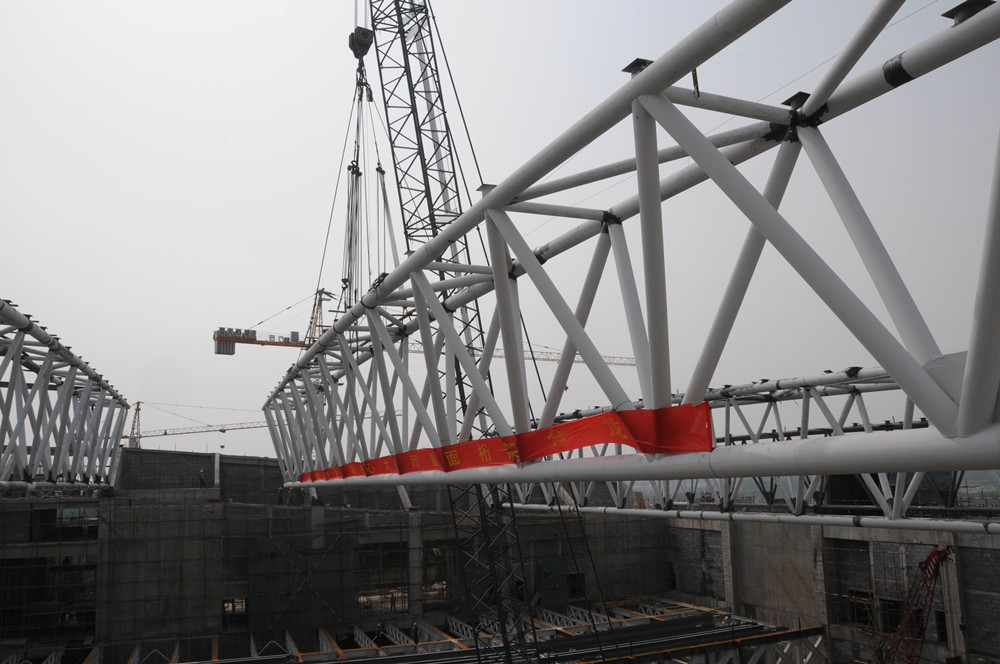 當天下午238分,會展中心工程現場鞭炮齊鳴,伴隨著320噸大吊車的一陣轟鳴,最后一榀97噸重的鋼構桁架徐徐升起、吊裝就位、校正扶位。集團公司總經理、會展中心工程總指揮朱九洲,會展中心工程現場總指揮孫孔喜,集團公司副總工程師、會展中心質量技術組組長王維奇及集團公司會展中心指揮部成員、參建單位項目經理參加了吊裝儀式。