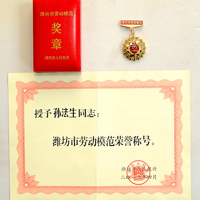 2013年4月27日上午,濰坊市委、市政府在市工人文化宮隆重召開濰坊市慶祝“五•一”國際勞動節(jié)暨勞動模范命名表彰大會,授予全市各行各業(yè)182名同志“濰坊市勞動模范”榮譽稱號,77名同志“濰坊市先進工作者”榮譽稱號。集團公司機械化施工分公司安拆班長孫法生榮獲“濰坊市勞動模范”榮譽稱號。