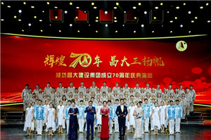 櫛風(fēng)沐雨砥礪行,春華秋實(shí)滿庭芳。2019年10月16日晚,慶祝集團(tuán)70華誕文藝晚會在濰坊文化藝術(shù)中心大劇院隆重上演。 集團(tuán)高管層領(lǐng)導(dǎo)徐鵬強(qiáng)、朱九洲、穆乃杰、姜建魯、閆鵬、房海、劉雁冰、張學(xué)智、吳杰出席。黨委書記、董事長徐鵬強(qiáng)代表領(lǐng)導(dǎo)班子致辭,表達(dá)了對黨的感恩之情。感謝各級政府和社會各界的大力支持,感謝一代一代昌大人的砥礪前行和奮斗,感謝昌大員工家屬的無私奉獻(xiàn)。集團(tuán)技術(shù)負(fù)責(zé)人、商務(wù)經(jīng)理及以上骨干人員現(xiàn)場觀看演出。 集團(tuán)特別感謝濰坊市歷屆黨委和政府一直以來對昌大的關(guān)愛和支持,特邀幫助昌大走出困境實(shí)現(xiàn)良性發(fā)展的黃濰連、劉偉、潘強(qiáng)等市里的老領(lǐng)導(dǎo)代表,特邀集團(tuán)合資、合作等有關(guān)方面的代表,特邀集團(tuán)改制前擔(dān)任過集團(tuán)正職的部分老領(lǐng)導(dǎo)以及改制后擔(dān)任過集團(tuán)領(lǐng)導(dǎo)后來退下來的老領(lǐng)導(dǎo),特邀企業(yè)發(fā)展之初老領(lǐng)導(dǎo)的家屬代表,特邀集團(tuán)榮獲省和全國勞動模范代表,特邀集團(tuán)基層單位經(jīng)理助理、集團(tuán)總部全體、集團(tuán)中層以上人員的家屬代表出席觀看文藝演出。 主題為“輝煌七十年?昌大正揚(yáng)帆”的慶典晚會,在一曲《在燦爛的陽光下》歌舞中拉開帷幕。晚會總體分為“致敬昨天?致敬今天?致敬未來”三個篇章,共十七個節(jié)目。無論是歌頌昌大人的歌曲《堅守》,還是謳歌關(guān)心昌大各界的相聲《非常嘉賓》,無論是《流光溢彩》的城市脈動,還是訴說過去的《往事只能回味》,無論是描寫建筑人的《我們和城市在一起》,還是表現(xiàn)昌大建設(shè)鐵軍精神的《城市筋骨》,無論是音詩畫般的《昌大一家人》,還是表現(xiàn)昌大員工情懷的《多想在平庸的生活擁抱你》,昌大人都在《致敬昨天》、《致敬今天》、《致敬未來》朗讀聲中盡情釋懷。昌大七十年,我們在《萬紫千紅分外嬌》的環(huán)境中奮發(fā),我們在《我和我的祖國》歌聲中與共和國一起成長。70年的奮斗,我們凝聚了《善建者的力量》。 昌大輝煌七十年,我們用頒發(fā)《昌大建設(shè)七十年》一書的隆重禮儀,揭開昌大歷史那頁頁篇章、續(xù)寫未來的美好與輝煌。 我們禮贊新中國七十年壯麗篇章;我們禮贊昌大七十年的美麗詩篇。七十年,我們感恩黨的陽光沐浴;我們感謝社會各界支持;我們感激昌大歷代員工;我們感慨昌大歷久彌新。 晚會讓昌大更加凝聚起了邁向新時代的力量,吹響了百年昌大的號角,讓我們“團(tuán)結(jié)奮斗,做新時代的建設(shè)者”! 晚會由濰坊電視臺內(nèi)專業(yè)人士執(zhí)導(dǎo)。濰坊電視臺、濰坊人民廣播電臺的嘉賓參與晚會主持和有關(guān)節(jié)目演出。 晚會現(xiàn)場,濰坊新聞網(wǎng)進(jìn)行了現(xiàn)場直播,半島網(wǎng)、今日頭條、騰訊視頻、優(yōu)酷、搜狐、愛奇藝、第一視頻、天天快報等進(jìn)行了視頻轉(zhuǎn)播和錄播;大眾網(wǎng)濰坊、半島網(wǎng)、今日頭條、天天快報、光新聞、濰坊早讀、濰坊日報、濰坊晚報等持續(xù)進(jìn)行文字播報和轉(zhuǎn)發(fā)。 慶祝集團(tuán)七十華誕的大型活動,集團(tuán)高管層領(lǐng)導(dǎo)正確決策和運(yùn)籌,各活動團(tuán)隊(duì)圍繞目標(biāo)和中心任務(wù)全力推進(jìn)、團(tuán)結(jié)協(xié)作,順利完成各項(xiàng)活動,達(dá)到了通過活動凝聚企業(yè)內(nèi)生動力、提升昌大品牌社會影響力、激勵廣大青年員工為未來而奮發(fā)的目的。在此,集團(tuán)向所有參與活動的單位和個人表示感謝!