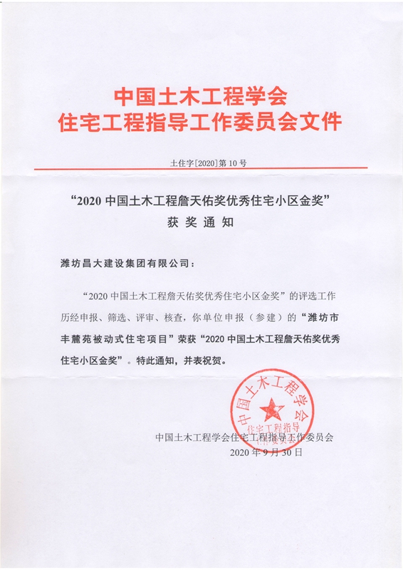2020年10月12日上午,集團收悉中國土木工程學會文件“2020中國土木工程詹天佑獎優秀住宅小區金獎獲獎通知”:歷經申報、篩選、評審、核查,集團申報的由集團二建公司總承包施工、二安公司參與施工的濰坊市豐麓苑被動式住宅項目榮獲“2020中國土木工程詹天佑獎優秀住宅小區金獎”。 據悉,這是濰坊歷史上首次獲得這一獎項。恭喜集團,恭喜集團全體員工,并向濰坊全體建筑業者分享這一榮譽。 附: 申報時間:2020年4月30日; 公示時間:2020年9月23日至30日; 獲獎時間:2020年9月30日。 ![]() |
