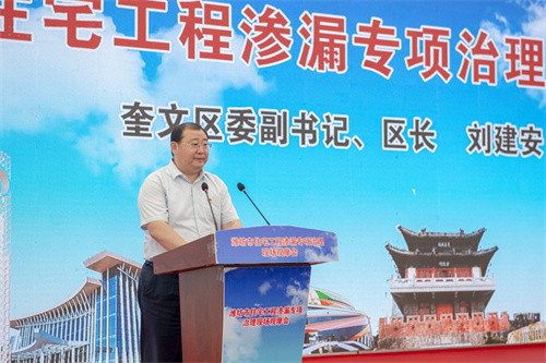 總裁朱九洲在致辭時說:住宅滲漏問題關系人民群眾居住生活質量,作為建筑業領軍企業,我們將帶頭全面落實各級主管部門部署,進一步完善質量管理機制,加強質量技術教育培訓,統籌做好各項工作,為濰坊市建筑業高質量發展做出積極貢獻。
