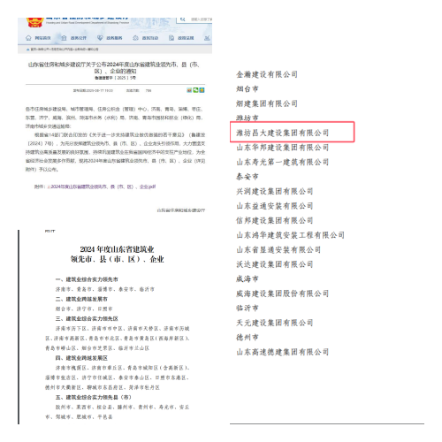 近日,山東省住房和城鄉(xiāng)建設(shè)廳發(fā)布了《關(guān)于公布2024年度山東省建筑業(yè)領(lǐng)先市、縣(市區(qū))、企業(yè)的通知》(魯建建管字[2025]5號)。集團(tuán)公司被評為2024年度山東省建筑業(yè)領(lǐng)先企業(yè)。