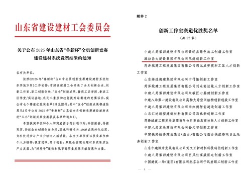 近日,山東省建設建材工會發(fā)布了《關于公布2025年山東省“魯新杯”全員創(chuàng)新競賽 建設建材系統(tǒng)競賽結果的通知》,集團公司王超工匠創(chuàng)新工作室榮獲創(chuàng)新工作室賽道優(yōu)勝獎。
